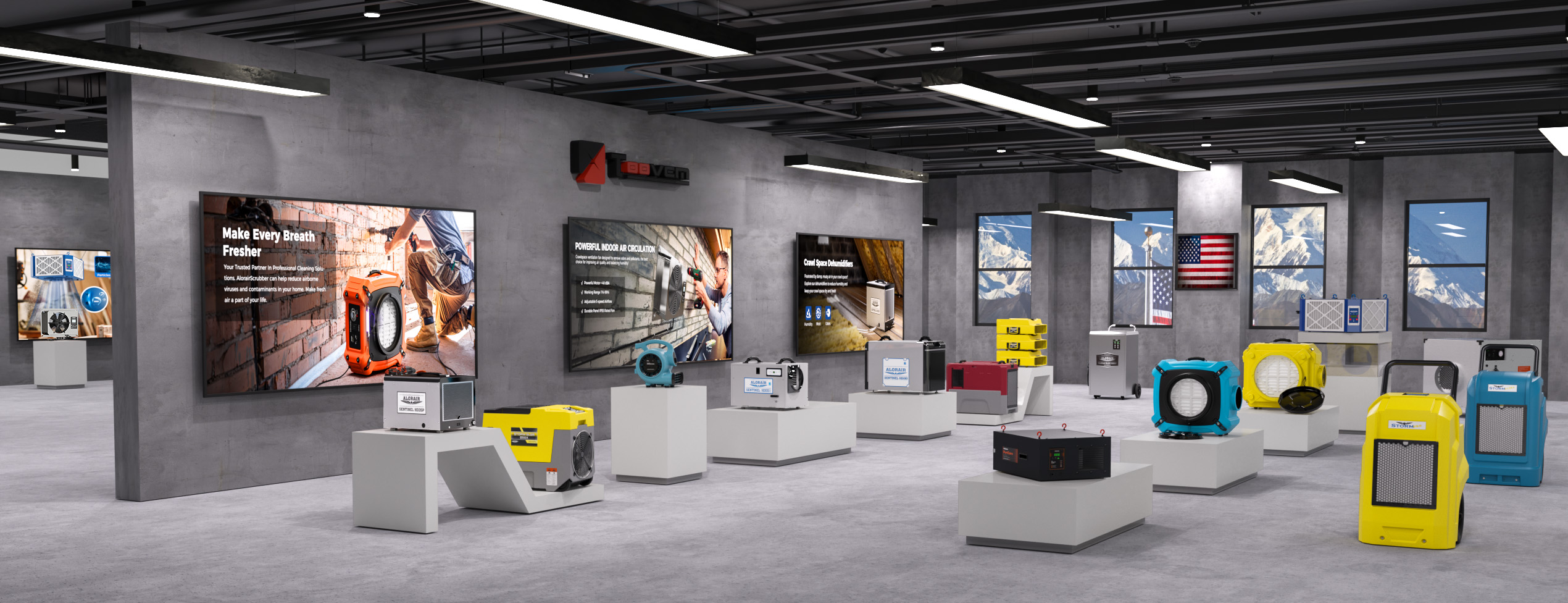 Serves as the global brand hub, showcasing the complete product portfolio across dehumidifiers, air movers, air scrubbers, and more. It highlights the brand's comprehensive strength and full-market coverage.